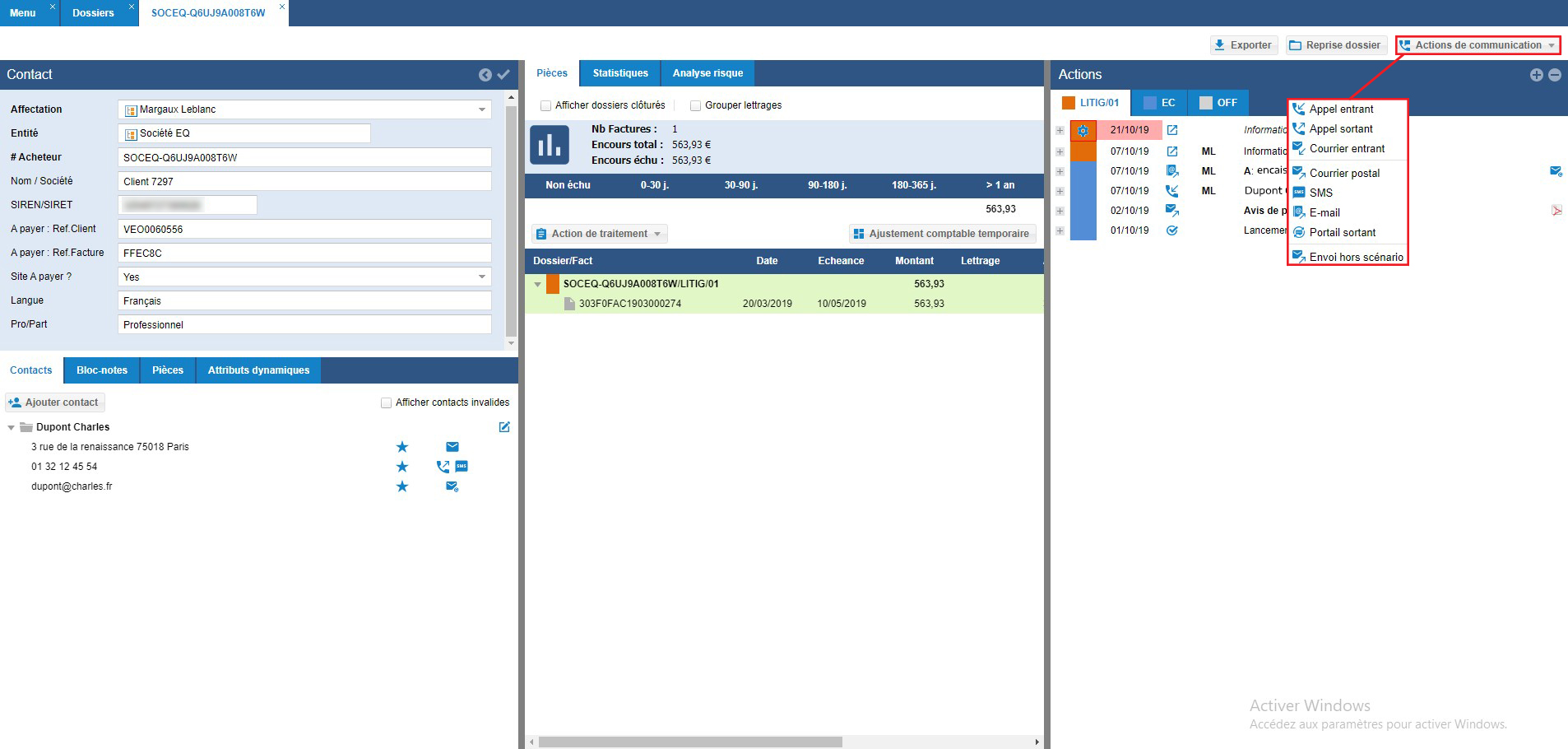 Les actions de communication sont soit programmées par les scénarios de relance soit réalisable à l’initiative du chargé de recouvrement dans le dossier client :
