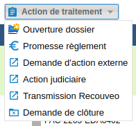 Dans la partie centrale du dossier client, le menu déroulant « action de traitement » permet de choisir le type d’action voulu :