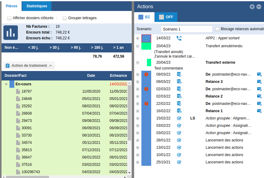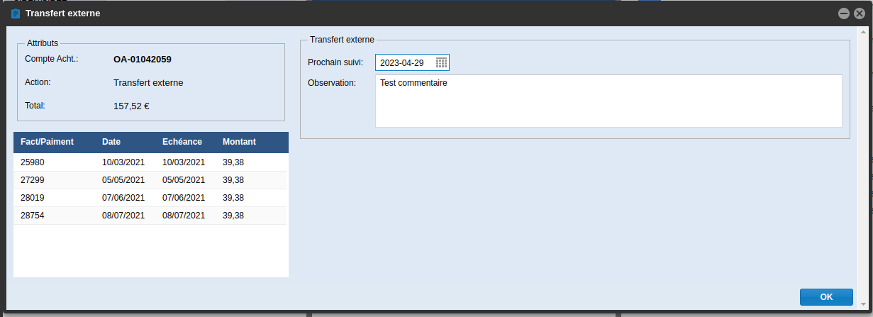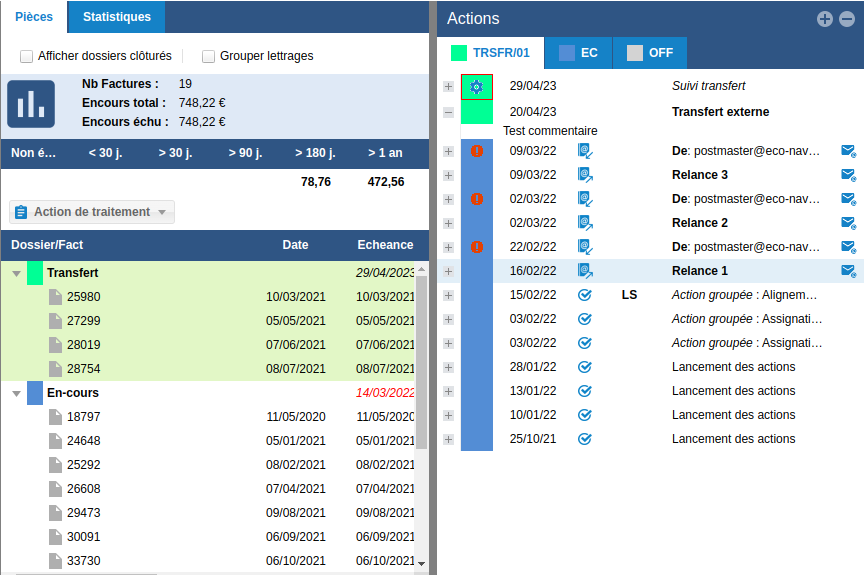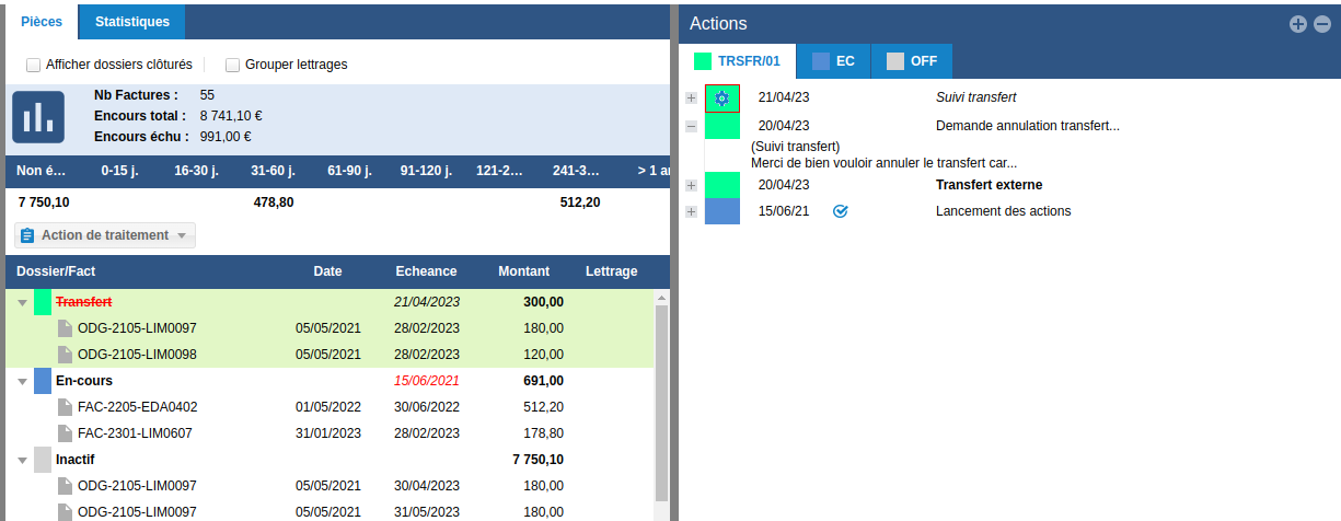 Les pièces sont déplacées de l'En-cours vers un nouveau dossier Transfert Le commentaire d'ouverture apparaît alors dans le détail de l'action.