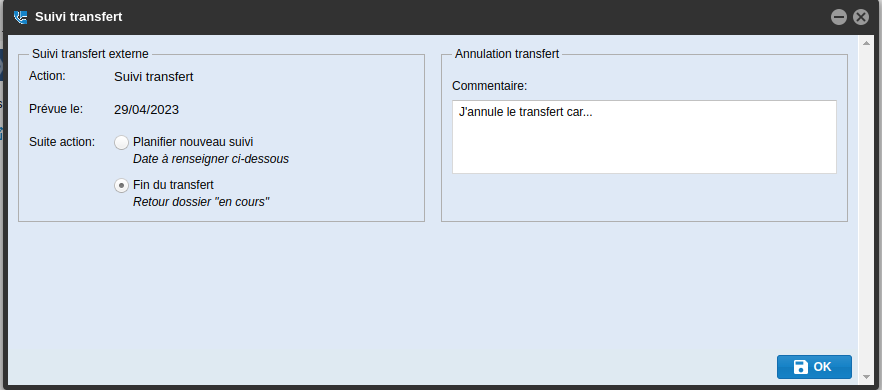 - Sélectionner dans la partie Suite action, Fin du transfert Retour dossier “en cours”
