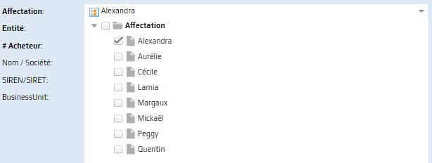 Il est possible de changer l’affectation d’un dossier à un collaborateur. Pour cela, sélectionner le menu déroulant dans la partie haute du bloc contact :