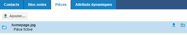 Tout comme les notes écrites, il est possible d'attacher des fichiers à une fiche client, elle peut ensuite être téléchargée ou supprimée grâce aux boutons correspondants. Les pièces correspondent à tous les documents que l'on enverra au client, il s'agit ici de les conserver afin d'en garder une trace.