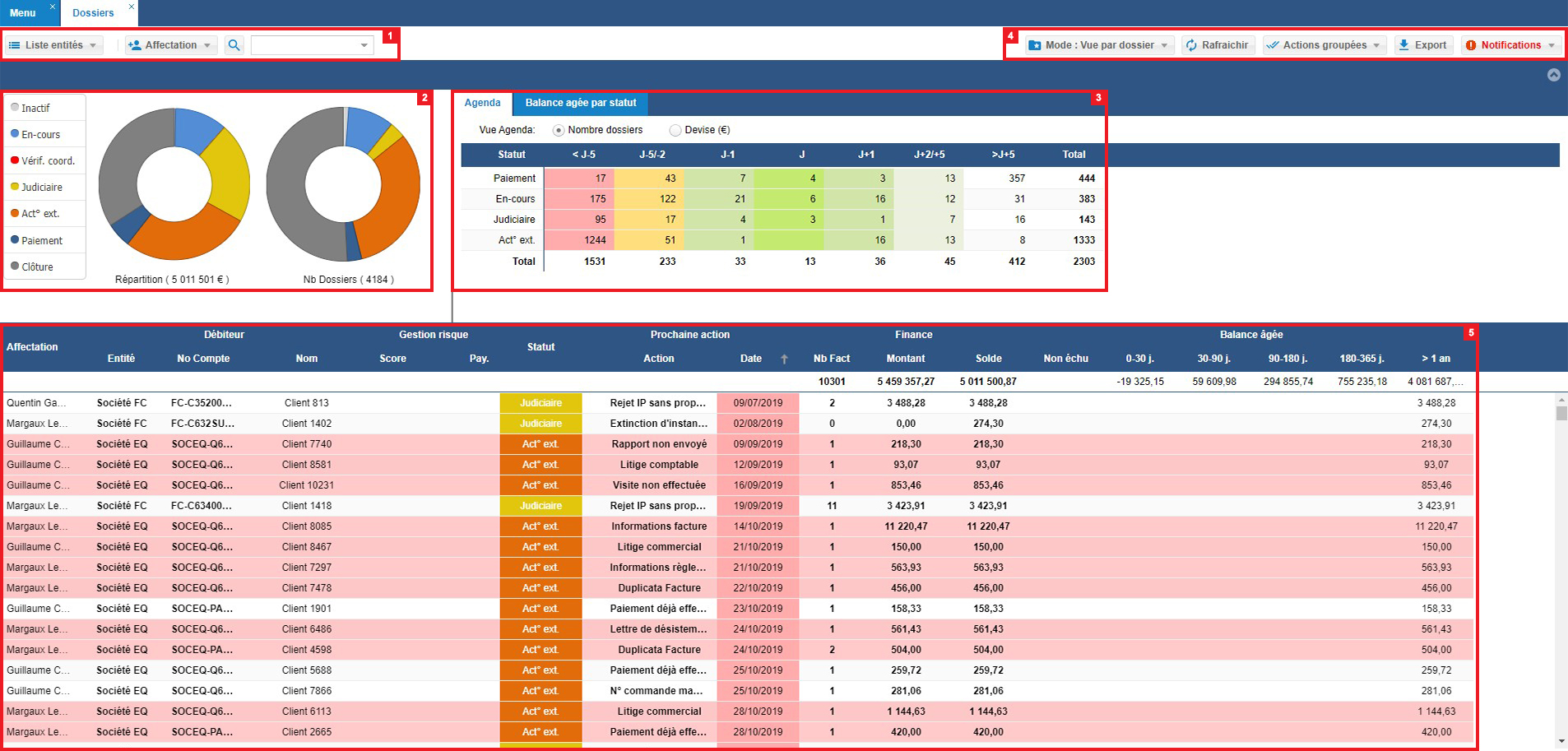 L’écran d’accueil du module de gestion des dossiers se compose de 5 parties :